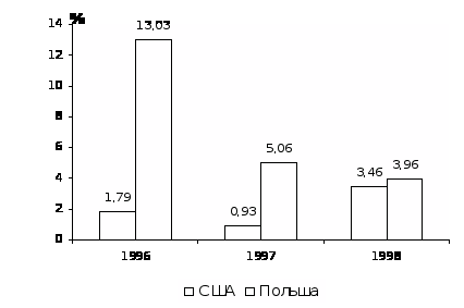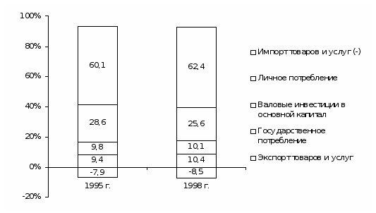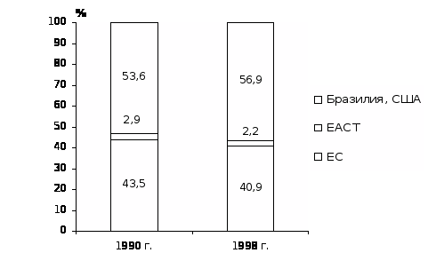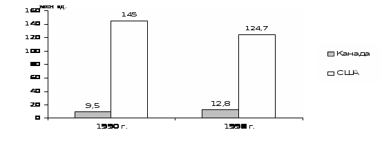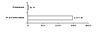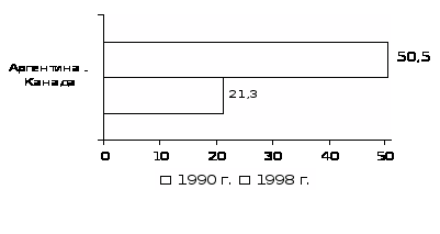 Между Аргентиной и Канадой разрыв по рассматриваемому показателю увеличивается, так как доля Аргентины сократилась до 21,3% ВВП Канады в 1998г. по сравнению с 50,5% в 1990г.