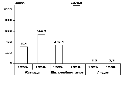 В 1998 г. в расчете на душу населения ввезенные иностранные инвестиции увеличились в Канаде на 73,5 %, в Великобритании на 210,6 %, а в Индии не изменились (2,3 долл. на душу населения).