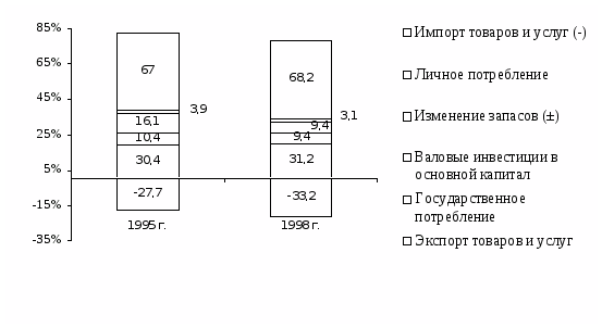 Абсолютные значения ввезенных и вывезенных инвестиций велики, но в инвестиционном процессе они играют вспомогательную роль: в процентах от ВВП ввезенные в 1995г. инвестиции Канады составляли 1,7 %, в 1998г. – 2,8 %, а вывезенные – 2,1 % и 4,5 % соответственно. В Великобритании в процентах от ВВП ввезенные в 1995 г. инвестиции составили 1,8 %, а в 1998г. – 4,7 %, а вывезенные – 4 % и 8,5 % соответственно. В Индии в процентах от ВВП ввезенные в 1995 г. инвестиции составили 0,6 %, такой же показатель и в 1998г.