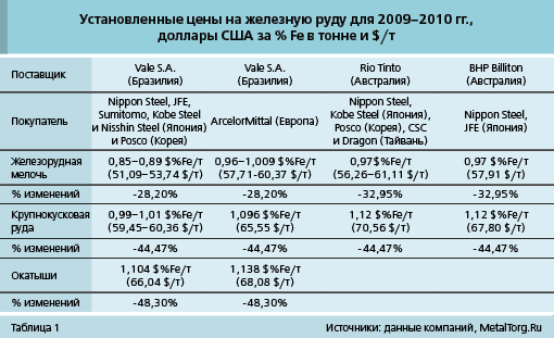 Аналитики считают, что установленные цены вполне можно считать базовыми, или benchmark. Так, в 2009–2010 гг. ориентировочная стоимость мелкодробленой руды (или концентрата) составляет $51–61 за т FOB, крупнокусковой – $59,5–70,5 за т, а окатышей – $66–68 за т.