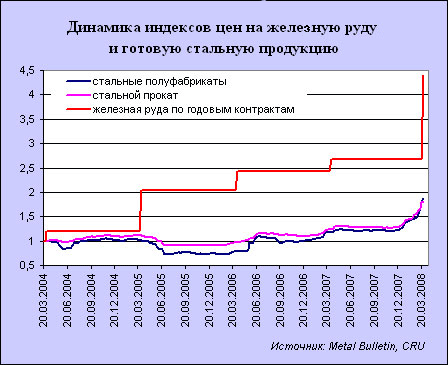 Аналитики Credit Suisse оценили, что в 2008г. цены на железную руду выросли примерно на 50%, а не на 35%, как ожидалось ранее. Стоит отметить, что обычно цены на это сырье устанавливают три крупнейшие в мире горнодобывающие компании - Vale, Rio Tinto и BHP Billiton - после переговоров с крупными мировыми производителями стали в Европе, Японии и Китае. Причем в последнее время спрос на это сырье растет именно по причине резкого увеличения производства стали в КНР, которая на данный момент является крупнейшим в мире импортером. По мнению экономистов банка Credit Suisse, в 2008 году дефицит этого сырья составил примерно 20-25 млн тонн.