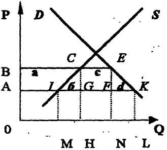 Оскільки світовий ринок може постачати у дану країну X необмежену кількість радіоприймачів за ціною ОA, лінія пропозиції буде мати вигляд горизонтальної прямої AK, яка покаже обсяг товару, доступний покупцям даної країни як із внутрішніх, так і з зовнішніх джерел. Попит дорівнює пропозиції в умовах вільної торгівлі у точці K, причому внутрішнє споживання становитиме ОL, внутрішнє виробництво — OM, а різниця між цими двома значеннями — ML — це обсяг імпорту. Отже, в результаті імпорту внутрішня ціна товару впала з рівня ОР>1> до рівня OA, а місцеві виробники продають на MQ>1> товару менше, ніж до початку торгівлі.