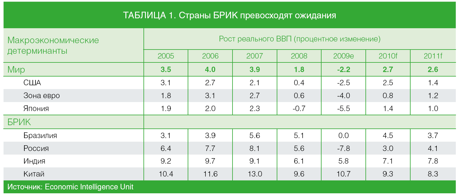 Понятие “BRIC”, включающее с себя четыре страны – Китай, Россию, Индию и Китай, за последние несколько лет достаточно прочно вошло в использование и укрепилось в лексиконе представителей деловых кругов. Одной из причин выделения этих стран в отдельную группу стал тот факт, что темпы развития их экономики оказались намного выше, чем прогнозировали эксперты банка, особенно в России и в Китае.