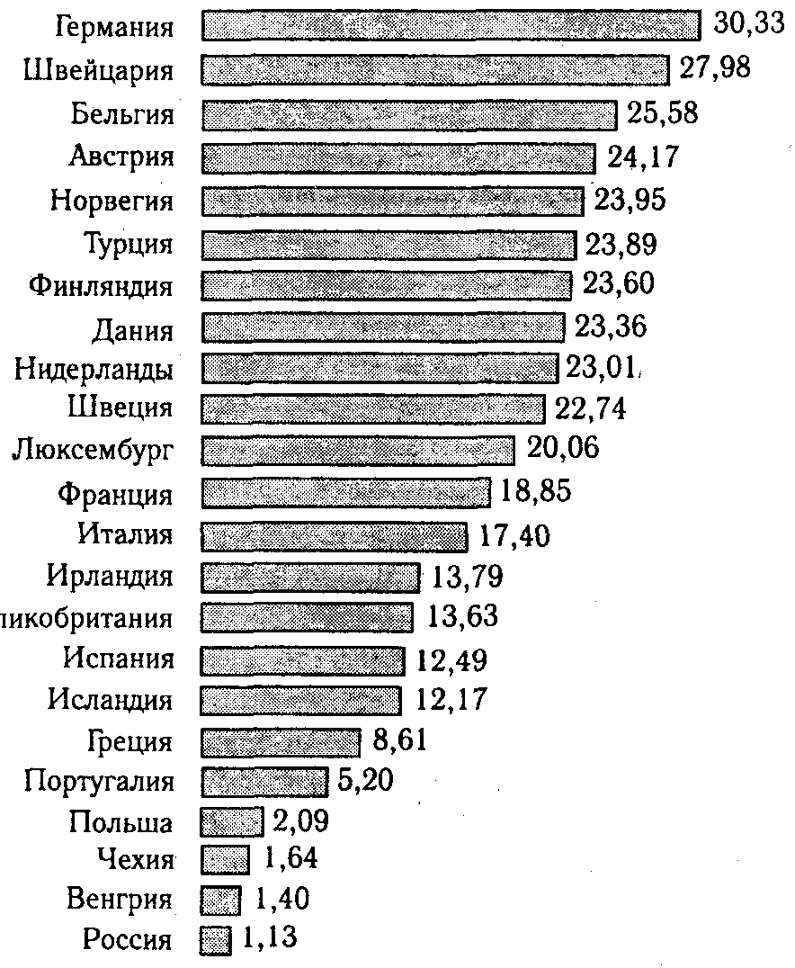В России этот показатель в 1995 г. составлял 2240 долл. Для того, чтобы оценить значение внешних факторов для экономического роста страны в статистике, в том числе и международной (СНС), используется относительный показатель соотношения объема внешней торговли страны с ее внутренним производством (ВВП) в сопоставимой валюте, традиционно в долларах. У малых стран такой показатель выше, поскольку они располагают меньшими ресурсами для внутреннего производства, и многое ввозится из-за рубежа в обмен на экспорт. У больших стран этот показатель ниже, поскольку разнообразно и значительно собственное производство и велика емкость национального рынка. Например, в Бельгии в начале 90-х гг. указанная величина достигала 190%, Швейцарии и . Венгрии — 160%, Болгарии — 110%. В средних по величине странах, таких, как Германия, Франция, Великобритания, этот показатель достигает 50-70%. В таких больших странах, как США; Индия, Китай, Бразилия, этот показатель равняется 20-30%. В СССР данный показатель составлял 4-6%, в 1995 г. в России — 30% (в основном это связано не с увеличением внешней торговли, ас падением внутреннего производства в 1991-1995 гг.).