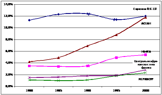 Следующий показатель – доля внутрирегионального товарооборота в процентах к общему совокупному внешнеторговому обороту стран региональных интеграционных группировок. Чем она выше, тем сильнее взаимосвязаны и взаимодополняемы экономики стран-партнеров, тем в большей степени можно говорить о едином региональном пространстве, лидирует по данному показателю Европейский союз – 62,5 % внешней торговли его членов приходится на внутрирегиональные связи. В НАФТА – 51%. Исключительным динамизмом отличается интеграция в МЕРКОСУР, если учесть, что с 1991 по 1998 г. данный показатель вырос с 11,7 до 24,8 %.