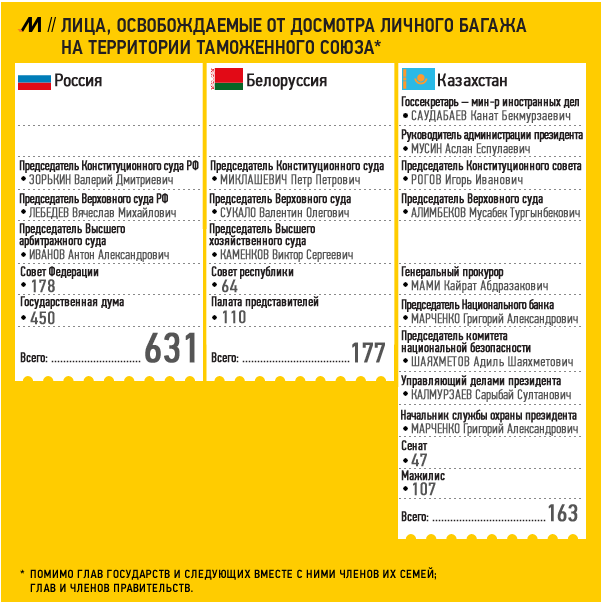Кодекс Таможенного союза освобождает от досмотра личного багажа глав государств и следующих вместе с ними членов их семей, глав и членов правительств, а также иных лиц — на основании дополнительных соглашений. Именно такое соглашение с Белоруссией и Казахстаном в начале июня одобрило правительство России. Документ планируется подписать на ближайшем заседании комиссии Таможенного союза на уровне глав государств, затем он должен быть ратифицирован.