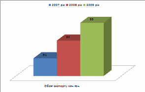 Проаналізувавши дані рис. 2.4. можна стверджувати, що стрімкими темпами зростає і ціна на рибу та рибопродукти, більшою мірою це відбувається через інфляційні процеси. Це впливає на обсяги вартісного вираження експорту і його частку у світовій торгівлі. На рисунку 2.5. зображено обсяги експорту риби та рибопродуктів у вартісному вигляді за 2007-2009 роки.