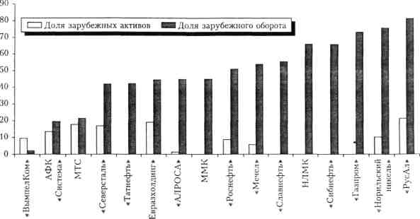 Рисунок 4 – Показатели зарубежной деятельности некоторых российских компаний в 2004г. (в%)11