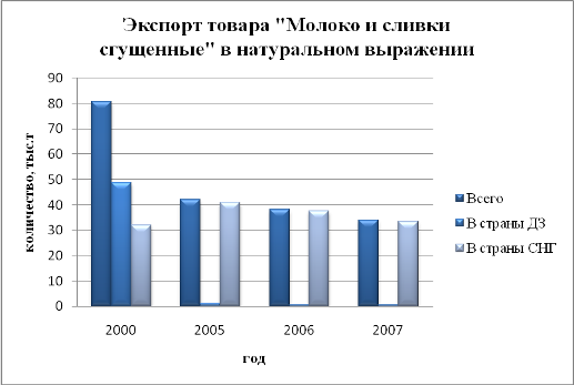 Экспорт товара "молоко и сливки сгущенные" на протяжении исследуемого периода сокращается как в количественном, так и в стоимостном выражении, особенно ярко это выражено в странах дальнего зарубежья. Следует отметить, что если в 2000 году большая часть экспорта рассматриваемого товара приходилась на страны дальнего зарубежья, то в последующие году (2005, 2006 и 2007) экспорт товара в эти страны резко сокращается. Если рассмотреть торговлю стран СНГ, то экспорт в стоимостном выражении заметно увеличивается (от 27,9 млн. долл. США в 2000г. до 52,6 млн. долл. США в 2007 году). Доля экспорта товара в страны СНГ в 2007 году составила 98,23 % в количественном и 98,13% в стоимостном выражении.