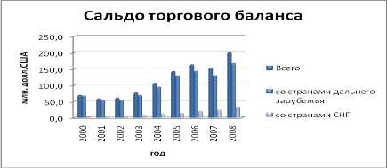 За исследуемый период (с 2000 по 2008 гг.) по данным таблицы 1.1 следует отметить, что экспорт, импорт, оборот возросли. Например, экспорт по результатам 2000 года составлял 103,1 миллиардов долларов США, а к 2008 году показатель возрос до 467, 9 миллиардов долларов США. Причем тенденция возрастания характерна как для стран дальнего зарубежья, так и для стран СНГ. Однако не во всех случаях тенденция возрастания происходила постепенно, по нарастающей, например, наблюдается снижение показателей экспорта со странами дальнего зарубежья в 2001г. по сравнению с 2000г.
