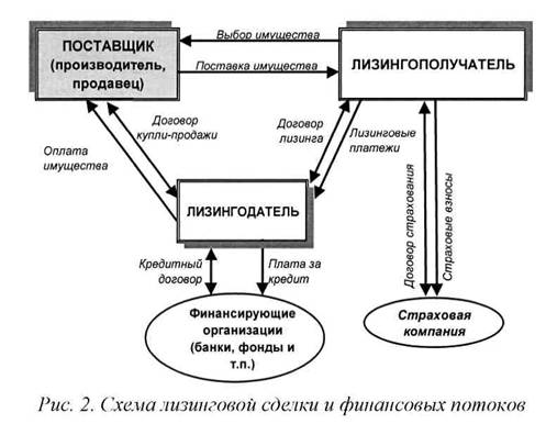 Состав участников сделки сокращается до двух, если продавец и лизингодатель, или продавец и лизингополучатель являются одним и тем же лицом. В случае реализации дорогостоящего проекта число участников сделки увеличивается. Это, как правило, происходит за счет привлечения лизингодателем к сделке новых источников финансовых средств (банков, страховых компаний, инвестиционных фондов и др.). Общая схема лизинговой сделки и финансовых потоков приведена на Рис. 2.