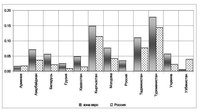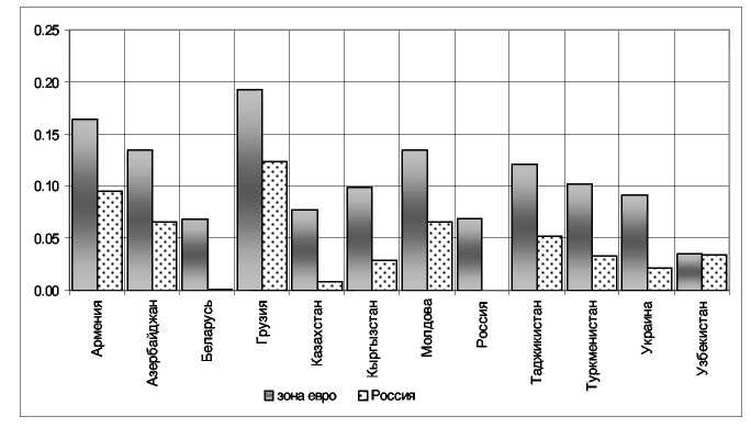 Такого роду підхід дозволить проаналізувати порівняльні характеристики країн СНД і оцінити, принаймні в першому наближенні, відносний розмір вигід і витрат валютної інтеграції в рамках обраних критеріїв для розглянутих країн. При цьому буде проведений порівняльний аналіз розрахованих показників для обраних країн стосовно Росії й стосовно зони євро.