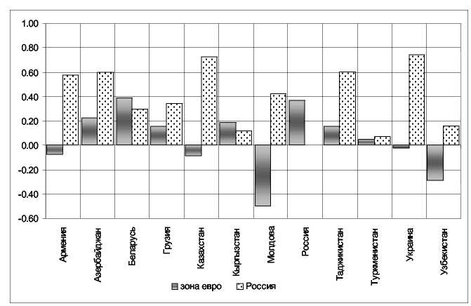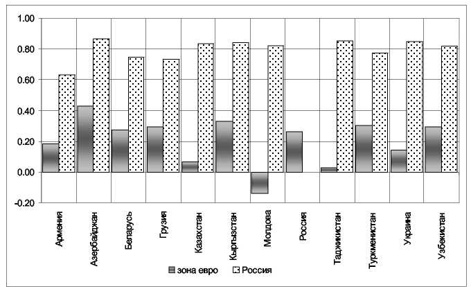 Розраховані значення коефіцієнтів кореляції для країн СНД стосовно показників країн зони євро й Росії представлені на мал. 3.2. При розрахунках використався ряд річних значень темпів росту реального ВВП у країнах СНД за період з 1999 по 2008 р. [12, с.119]