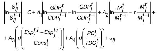 SIZE>ij> - середнє значення логарифмів реального ВВП, вираженого в доларах США, для країн i та j [5, с.76].