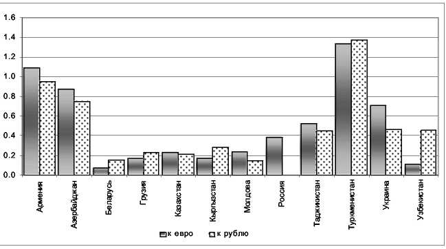 Насамперед відзначимо, що для одних країн меншої виявляється волатильність курсу стосовно рубля, тоді як для інших - до євро. Країни СНД можна умовно розділити на три групи. Перша група - це країни, що характеризуються досить високої волатильністю обмінного курсу національної валюти стосовно рубля, серед яких Азербайджан, Вірменія й Туркменістан. У другу групу з відносно низкою волатильністю курсу входять такі країни, як Бєларусь, Грузія, Казахстан, Киргизстан і Молдова. В інших країнах волатильність обмінного курсу близька до середнього. Якщо розглянути курс до євро, то розбивка країн по групах практично не міняється. Виключення становлять Узбекистан (низька волатильність) і Україна (відносно висока волатильність).