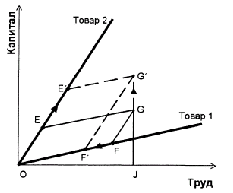 Предположим, что размеры капитала возросли на GG', при этом размеры другого фактора производства (труда) и цены на товары 1 и 2 остались неизменными. Если построить новую параллелограмму от точки G', показывающей изменившийся уровень обеспеченности капиталом, то очевидно, что после роста обеспеченности капиталом производство трудоемкого товара 1 переместится в точку F', а производство капиталоемкого товара 2 — в точку Е'. Производство капиталоемкого товара 2 в результате увеличения размеров капитала возросло на ЕЕ', а производство трудоемкого товара 1 сократилось на FF'. Тем самым увеличение обеспеченности одним из факторов приводит к росту выпуска того товара, для производства которого он используется относительно более интенсивно, и сокращению выпуска товара, для производства которого он используется относительно менее интенсивно. Нетрудно также заметить, что ЕЕ70Е > GG7JG. Это означает, что увеличение размеров капитала привело к пропорционально большему увеличению производства капиталоемкого товара.