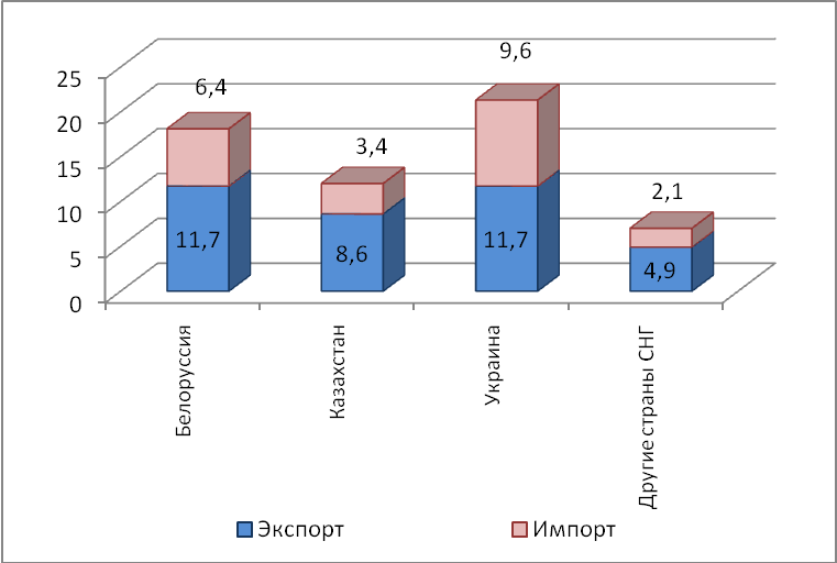 Первое место среди этих стран занимает Украина, доля которой составляет 5,6%. Во внешней торговли с Россией доля Беларуси составила 4,8%. В то же время динамично продолжают развиваться торговые связи с Казахстаном, доля которого в товарообороте с Россией увеличилась с 2,9% до 3,2% как за счет роста экспорта, так и импорта.