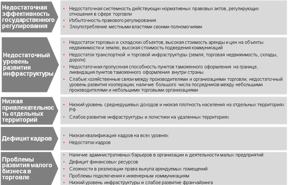 Злоупотребление местными властями своими полномочиями – одно из существенных препятствий для развития торговли в стране. Местные власти зачастую имеют личную заинтересованность в бизнесе региональных розничных компаний и препятствуют развитию конкуренции, затягивая выдачу разрешений на строительство, лицензий и других документов новым игрокам. Кроме того, высокий уровень коррупции при получении разрешений, лицензий, сертификатов и проведение различных проверок существенно увеличивает необходимые для развития торговли инвестиции и расходы, что снижает инвестиционную привлекательность отрасли.