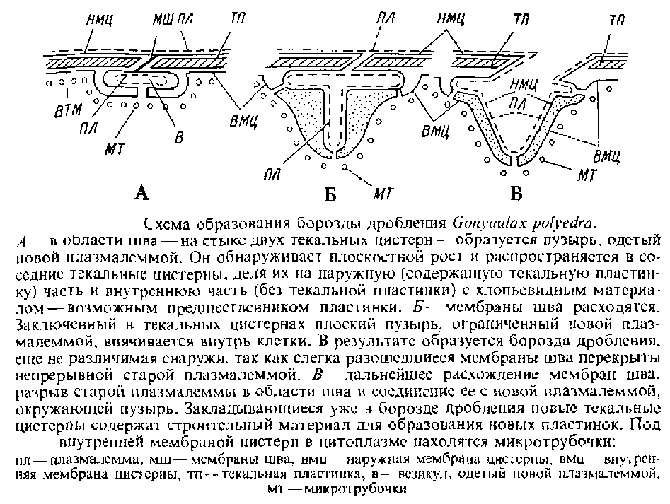 Еще во время деления клетки в текальных цистернах и отчасти в пластинах появляются везикулы с двойной стенкой. При увеличении этих везикул в направлении, параллельном поверхности, как и при образовании борозды дробления, текальные цистерны расщепляются на наружную часть, содержащую пластинку, и внутреннюю, возможно, с остатками старой пластинки. При разрыве пузыря-везикула у расширенных краев кольцевых пор, выстланных плазмалеммой и наружной мембраной цистерны, внутренняя мембрана пузыря соединяется с плазмалеммой, а наружная --с наружной мембраной текальной цистерны. Наружная часть текальной цистерны, содержащая старую пластинку, пронизанную порами, изолируется и сбрасывается, а во внутренней части возникает новая пластинка.
