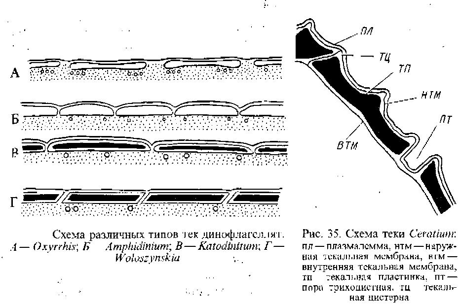 Клеточный покров. У монадных клеток динофитовых водорослей имеется сложный клеточный покров — тека или амфиезма, представленный цитоплазматической мембраной, под которой в один слой располагаются компоненты теки — уплощенные пузыри, окруженные одиночной мембраной. Число текаль-ных цистерн в клетке варьирует от нескольких сотен до двух. Расположение текальных везикул под плаз-малеммой неодинаково. Например, у рода оксирис они разъединены друг от друга, а у гимнодиниума, амфидиниума и других родов везикулы соприкасаются друг с другом у своих краев и приобретают многоугольные очертания. Везикулы у одних представителей, таких, как гимнодиниум, клетки которых в оптическом микроскопе выглядят как голые, не содержат текальпых пластинок, в них наблюдается только зернистое содержимое. У других в цистернах находятся целлюлозные пластинки, различающиеся по толщине. Имеется обратная зависимость между толщиной пластинок и их числом. Чем толще пластинки, тем их меньше. У катодиниума везикулы содержат тонкие пластинки, а у волошинскии пластинки достаточно толстые, чтобы их можно было различить в оптическом микроскопе. У родов гленодиниум, перидиниум, цератиум число пластинок редуцируется приблизительно до двадцати, они очень толстые и могут нести шипы, различные выросты, иметь сетчатый узор.