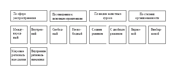 Мировой валютный рынок - это совокупность отношений, возникающих между фирмами, домохозяйствами, коммерческими банками и другими финансовыми учреждениями по поводу международных сделок с валютами разных стран, образует мировой валютный рынок (виды валютных рынком указаны на рис.1). Важнейшими экономическими агентами этого рынка являются коммерческие банки, государственные финансовые учреждения, многонациональные корпорации, небанковские финансовые учреждения. По объему операций мировой финансовый рынок является крупнейшим среди всех прочих рынков. Современные средства связи и телекоммуникаций связывают мировые финансовые центры в единое целое. Развитие мирового валютного рынка характеризуется усилением интернационализации связей, расширением спектра предоставляемых услуг, непрерывностью осуществления операций, растущими масштабами спекулятивных сделок и арбитражных операций. Равновесие мирового валютного рынка обеспечивается в том случае, если депозиты, выраженные в различных валютах, обеспечивают получение равного сопоставимого дохода. Это условие получило название паритета процентных ставок. Валютные курсы изменяются таким образом, чтобы сохранялся паритет процентных ставок. На изменение валютного курса оказывает влияние также характер ожиданий его будущего значения.