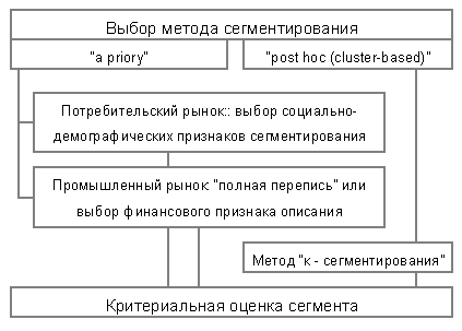 В мировой практике используются два принципиальных подхода к маркетинговому сегментированию. В рамках первого метода, именуемого "a priory", предварительно известны признаки сегментирования, численность сегментов, их количество, характеристики, карта интересов. То есть подразумевается, что сегментные группы в данном методе уже сформированы. Метод "a priory" часто используют в тех случаях, когда сегментирование не является частью текущего исследования, а служит вспомогательным базисом при решении других маркетинговых задач. Иногда этот метод применяют при очень четкой определенности сегментов рынка, когда вариантность сегментов рынка не высока. "А priory" допустим и при формировании новой услуги, ориентированной на известный сегмент рынка. В настоящем пособии метод реализации сегментирования "a priory" рассмотрен в разделе 1.