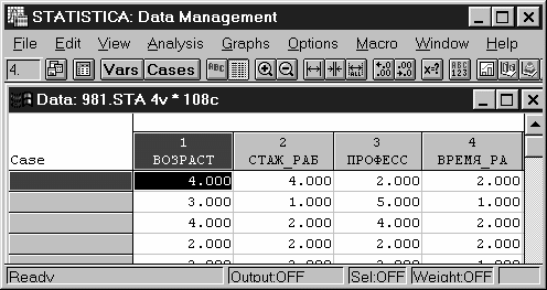 Рис. 2. Внешний вид результатов опроса, занесенных в исследовательский массив в программе STATISTICA 3