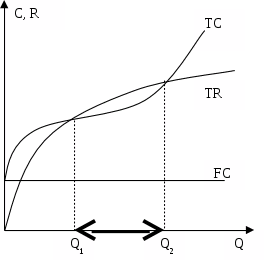 Г-н Липсиц просил студентов запомнить две важные вещи. Во-первых, что TR – это sales или, по крайней мере, выручка от продаж, и называть его принято среди воротил бизнеса именно так, а если кто скажет (при них) ”total revenue”, то его просто не поймут, ибо revenue – это доход, а на их языке доход – это прибыль. График издержек производства в точке, соответствующей Q2, делает резкий подъем, что связано с двумя независимыми процессами. С одной стороны, это объясняется крутизной подъема фиксированных издержек (это следует из концепции маржинальных издержек), а, с другой стороны, с этого момента приходит насыщение рынка. Во-вторых, необходимо отметить, что хотя на графике получается две точки пересечения кривых TR и TC, ВЕР’ом является только первая точка (та, которой соответствует объем продаж Q1). Двухсторонней жирной стрелочкой на графике обозначен запас финансовой прочности проекта, то есть то количество продукции, которое будет приносит прибыль. Этот график можно строить исходя из того, что откладываемые по оси абсцисс количества – это либо весь объем производства продукции, либо годовой масштаб производства. Смысл запаса финансовой прочности состоит в том, что по сути он показывает нам степень рискованности нашего проекта. Если он составляет 5-10% от ВЕР, то мы очень сильно рискуем, так как стоит нам чуть-чуть ошибиться в расчетах или капельку изменится экономическая ситуация, как мы очень серьезно пролетим.