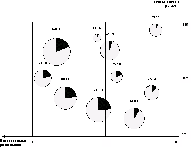 По данным таблицы 7 и результатам вычислений таблицы 8 можно построить матрицу Мак-Кинси, где каждое СХП представлено в виде окружности, диаметр которой пропорционален емкости рынка, а сектор внутри окружности отражает долю рынка данного СХП. Данная матрица представлена на рисунке 6.