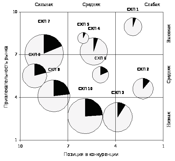 СХП 9 и 10 – занимают лидирующее положение на зрелых, насыщенных, подверженных застою рынках. За счет высокой доли рынка они, также как и СХП 8, имеют значительную экономию в затратах и приносят большую прибыль, чем требуется для поддержания их доли на рынке. Для них наилучшей является стратегия сохранения доли рынка.
