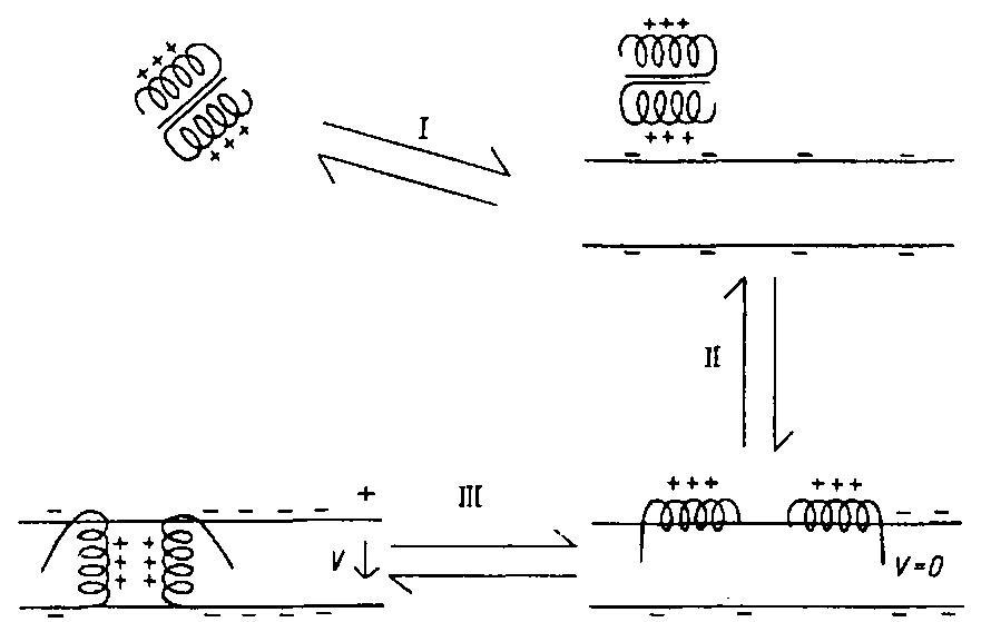 При типичной ориентации электрического поля мембран катионные АП могут переноситься через этот барьер путем электрофореза, подобно тому как это описано для микробных пептидных антибиотиков полимиксина В и грамицидинов., что дополняет картину деструктурирующих воздействий наv клетки-мишени, результатом которых является гибель последних. Обобщенная схема предполагаемого механизма антимикробного действия одного из антибиотических пептидов - цекропина - представлена на рис. 20. Первая фаза действия пептида связана с адсорбцией димера цекропина на поверхности мембраны за счет электростатических взаимодействий с ее отрицательно заряженными соединениями. На следующей стадии происходит диссоциация димера и внедрение в липофильную фазу липидного бислоя отдельных молекул цекропина за счет гидрофобных взаимодействий. На заключительной стадии внедрившиеся и ориентированные поперек мембран молекулы цекропинов формируют каналоподобные поры с умеренной селективной проницаемостью для анионов.