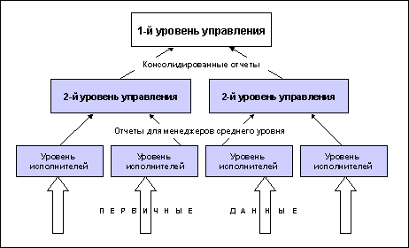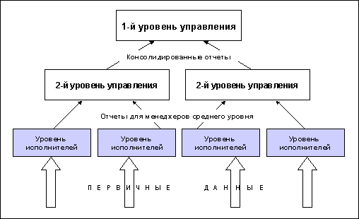 уществует несколько подходов к внедрению информационной системы в работу предприятия.2 Для рассмотрения двух из них будет использоваться пример организации, имеющей три уровня иерархии: уровень исполнителей и два уровня управления (рис. 3).
