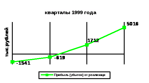 Динамический рост прибыли (убытка) от основной деятельности нарастающим итогом по кварталам 1999 года можно представить на следующем графике: