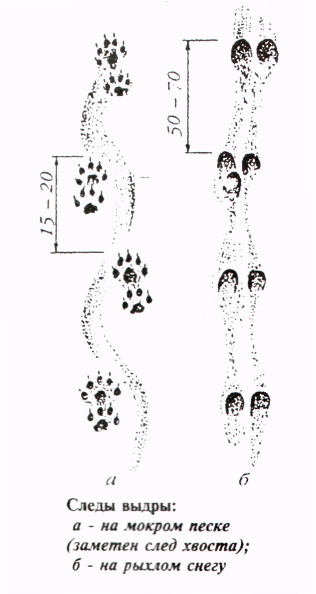 Выдры в воде очень ловки, но это нельзя сказать по поводу их поведения на суше. Передвигаются обычно рысью, но, имея сравнительно короткие конечности, по рыхлому снегу вынуждены передвигаться галопом, причем на прыжках сильно горбятся, как и другие коротконогие куньи. Лапы у зверя пятипалые. Однако первый палец на передней лапе короче других и при ходьбе не всегда оставляет отпечаток. На мягком грунте бывают хорошо заметны следы плавательных перепонок. Способны делать прыжки длинной до 1,5 метров. По рыхлому снегу передвигаются с трудом, оставляя след в виде глубокой борозды (см. приложение). Если же снег несколько уплотнен, то они чередуют короткие, по 40-50 см, разбеги рысью или прыжки по 50-70 см со скольжением на брюхе. На новом месте выдра способна скользить на брюхе по 4-5 метров после каждого разбега. С горы таким образом могут съезжать на большие расстояния (40-50 метров). При передвижении семьи по снегу разбегается и скользит обычно только взрослая особь, а молодые идут по ее следу. Молодые в возрасте 3-5 месяцев при переходах иногда отстают от взрослых на расстоянии до 50 метров, и в этом случае они издают характерный свист. Если при семье находится в этот момент самец, то он периодически сменяет идущую впереди самку. Иногда при прокладывании тропы в таком чередовании участвуют и молодые особи, если они по размерам почти достигают взрослых. Такую картину можно наблюдать с конца зимы до середины весны.