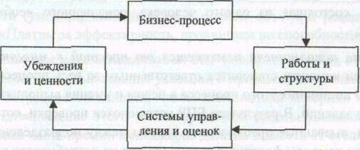 Представим компанию после проведения БПР в виде замкнутой бизнес системы, изображенной на рис.1. Стрелки между элементами этой структуры показывают характер их взаимодействия: блок «Бизнес-процесс» определяет содержание блока «Работы и структуры», связанного с блоком «Системы управления и оценок», который, в свою очередь, определяет работу блока «Убеждения и ценности», влияющего на блок «Бизнес-процесс».