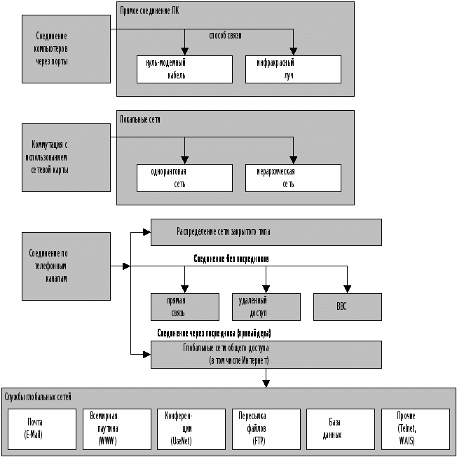 Рисунок 13 - Способы коммутации компьютеров и виды сетей.