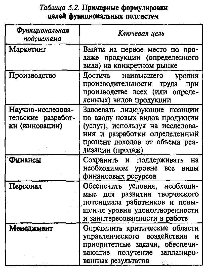 В качестве примера ниже рассматривается процесс целеполагания по функциональным подсистемам, чаще всего выделяемым в организациях (маркетингу, нововведениям, производству, персоналу, финансам и общему менеджменту), и в табл. 5,2. приводятся примерные формулировки целей по этим подсистемам. В реальных условиях эти цели должны быть конкретизированы и количественно измерены с помощью соответствующих показателей.