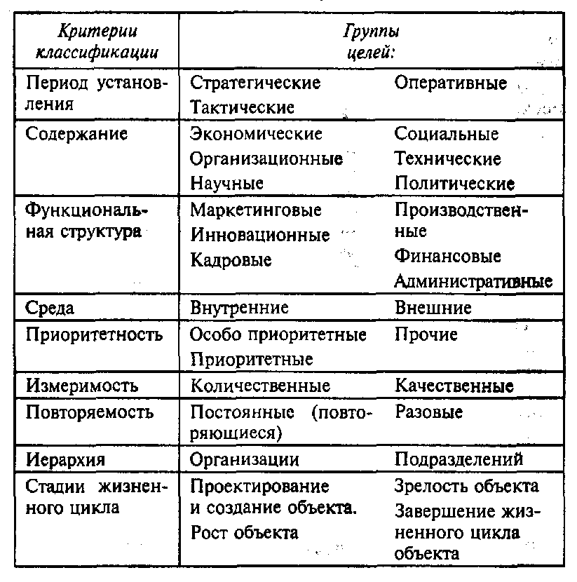 Как правило, организации ставят и реализуют не одну, а несколько целей, которые важны для их функционирования и развития. Наряду со стратегическими целями и задачами приходится решать огромное количество текущих и оперативных. Кроме экономических — стоят социальные, организационные, научные и технические задачи. Наряду с регулярно повторяющимися, традиционными проблемами менеджеры должны принимать решения по непредвиденным ситуациям и т.д. Классификация целей позволяет конкретизировать задачу целеполагания и использовать соответствующие механизмы и методы, наработанные для разных групп целей. Один из возможных вариантов классификации целей представлен в табл. 5.1.