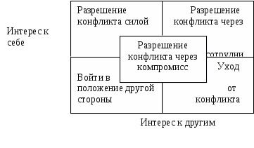 Через компромисс: учет интересов всех сторон, реализация через переговоры, в ходе которых каждая сторона идет на уступки. Но здесь не удается добиться взаимной абсолютной удовлетворенности, но нет и абсолютной неудовлестворенности.