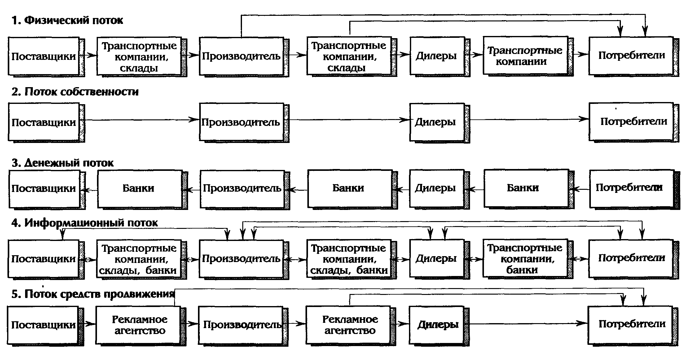 На рис. 5 представлены пять таких потоков, возникающих при продажи грузоподъемников. Все они представлены на одной диаграмме и помогают понять, насколько сложны даже самые короткие каналы распределения.