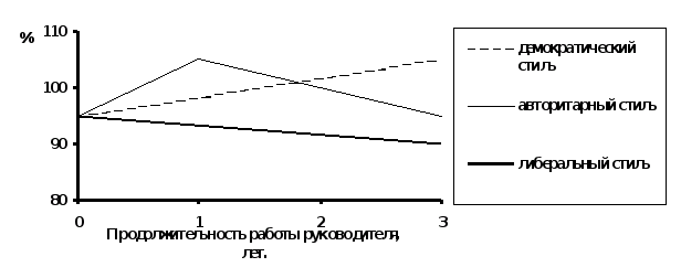 Влияние стилей управления на эффективность работы групп в течение продолжительного времени исследовали и немецкие ученые. Было установлено, что результативность труда постоянно повышалась у коллектива, где преобладал демократический стиль руководства, снижение эффективности – у коллектива с либеральным и авторитарным стилем .
