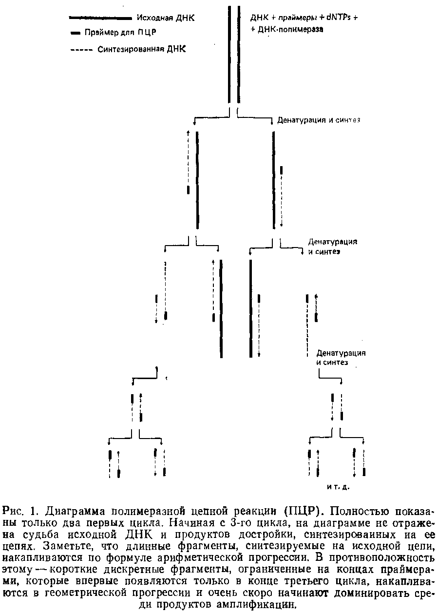 В результате происходит экспоненциальное увеличение количества специфического фрагмента приблизительно по формуле 2n, где п — число прошедших циклов амплификации. Поскольку праймеры физически включаются в концы продуктов застройки, они детерминируют сам продукт реакции — фрагмент ДНК, равный по длине расстоянию между 5'-концами праймеров на исследуемом участке ДНК. Недавние эксперименты показали, что процесс амплификации идет гораздо более эффективно, если использовать термостабильную ДНК-полимеразу, выделенную из бактерии Thermits aquaticus. В отличие от термолабильного фрагмента Клёнова ДНК-полимеразы I Е. coli, использовавшегося ранее, Год-полимераза сохраняет свою активность после тепловой денатурации ДНК, и нет необходимости в замене фермента после каждого цикла. Еще одно достоинство новой полимеразы заключается в более высоком температурном оптимуме детерминируемой ею реакции, что значительно повышает специфичность, количественный выход и возможную длину синтезированных копий интересующей последовательности.