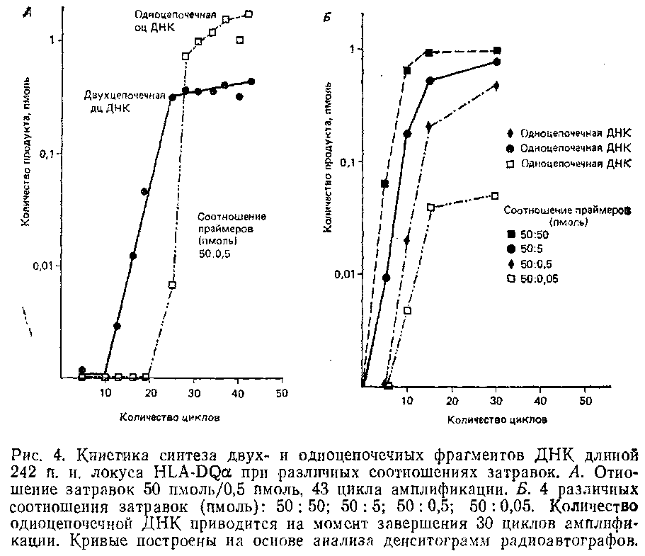 Рис. 4, А демонстрирует накопление дцДНК и оцДНК в ходе обычной амплификации геномной последовательности, использующей исходное соотношение затравок 50:0,5 пмоль в 100 мкл реакционной смеси. Как и ожидалось, количество дцДНК возрастает экспоненциально до момента практического исчезновения из реакционной смеси одного из праймеров, после чего количество этой ДНК нарастает очень медленно. Фракция оцДНК появляется, начиная с 25-го цикла, с момента, когда запас лимитирующей затравки почти полностью исчерпан. После короткой начальной стадии быстрого роста оцДНК накапливается линейно, чего следует ожидать в присутствии одного праймера.