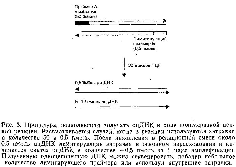 Разные соотношения праймеров дадут в принципе сходную картину образования оцДНК. Различные неравные отношения 50:5, 50:0,5, 50:0,05 дают за 30 циклов полимеразной реакции количество оцДНК, превышающее количество синтезированной дцДНК. Как правило, соотношение 50:0,5 позволяет получить после 30 циклов ПЦР 1-5 пмоль оцДНК. Образованная оцДНК может быть затем секвенирована с использованием лимитирующего праймера ПЦР или внутреннего праймера по обычной схеме химической или энзиматической методики секвенирования. Синтезированные фрагменты будут иметь гомогенный 5'-конец и в различной степени усеченный 3'-конец вследствие преждевременной терминами синтеза. Однако при использовании некоторых секвенационных затравок только полная оцДНК. может служить образцом для секвенирования.