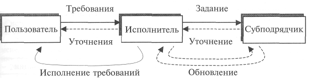 В ОКП «Управление конфигурацией» входят процессы, связанные с подготовкой и отсылкой версий конечным пользователям. Если последних рассматривать как партнеров, участвующих в разработке ПО и вносящих свои замечания, то обновления версий могут быть достаточно частыми. В данном случае система «Управление конфигурациями» должна стоять у конечного пользователя и быть связана с системой учета требований (схема 3).