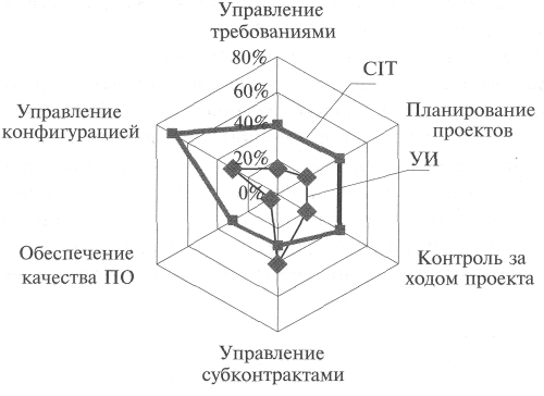 Исходя из оценки зрелости ОКП по итогам внедрения СММ, CIT (схема 4) ближе ко второму уровню СММ. Наблюдается отставание только по двум ОКП: «Управление работами с субподрядчиками» (связано с тем, что привлечение субподрядчиков было эпизодическим) и «Обеспечение качества ПО»