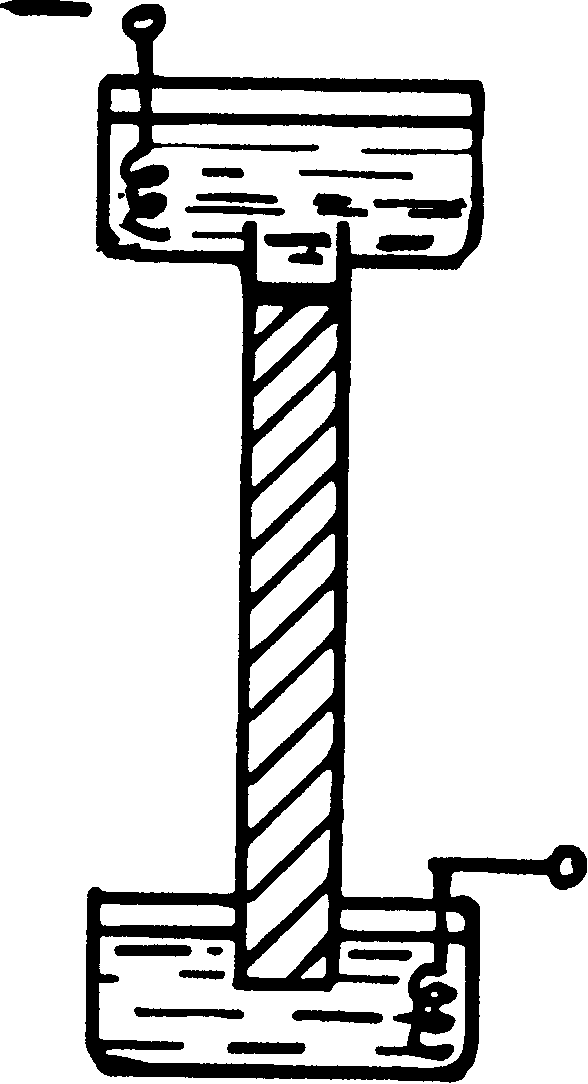 Но что же это за сетка, которую мы хотим создать? И как это сделать? Скорее всего это будет гель, подобный пищевому желе, которое получают очень небольшой добавкой желатина к фруктовому соку, или нечто похожее на уже знакомый нам агар. Прежде, чем поговорить об этом геле подробнее, отметим, что благодаря силам смачивания жидкость из геля с достаточно мелкими порами не будет вытекать, даже если она составит 95% его массы. А это значит, что заполнив нашу трубочку гелем, мы можем поставить ее вертикально, как это показано на рис. 36. Кстати сказать, так и выглядели первые приборчики для электрофореза.
