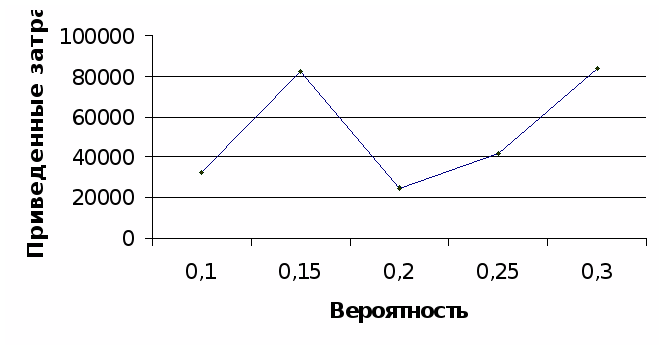 Таким образом, минимальные затраты при минимальной вероятности, а максимальные затраты - при максимальной вероятности. При вероятности р=0,15 достаточно малой, слишком большие затраты. Остаются две точки с вероятностью р=0,2 и р=0,25. Однако при небольшом приросте затрат, график показывает достаточный прирост вероятности.