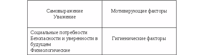 Согласно выводам Герцберга, полученные ответы можно подразделить на две большие категории, которые он назвал «гигиеническими факторами» и «мотивацией» (таблица 1).