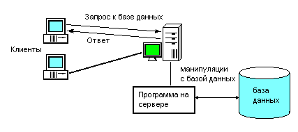 клиент формирует и посылает запрос к базе данных сервера, вернее – к программе, обрабатывающей запросы.